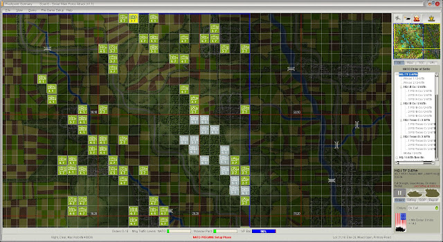 This is the pregame setup phase where I can take the default disposition of forces and drag and drop them where I like within the blue bounding box. The game map replicates an area of the western portion of the Federal Republic of Germany measuring 20 km X 15 km, while each grid square represents 500 meters.