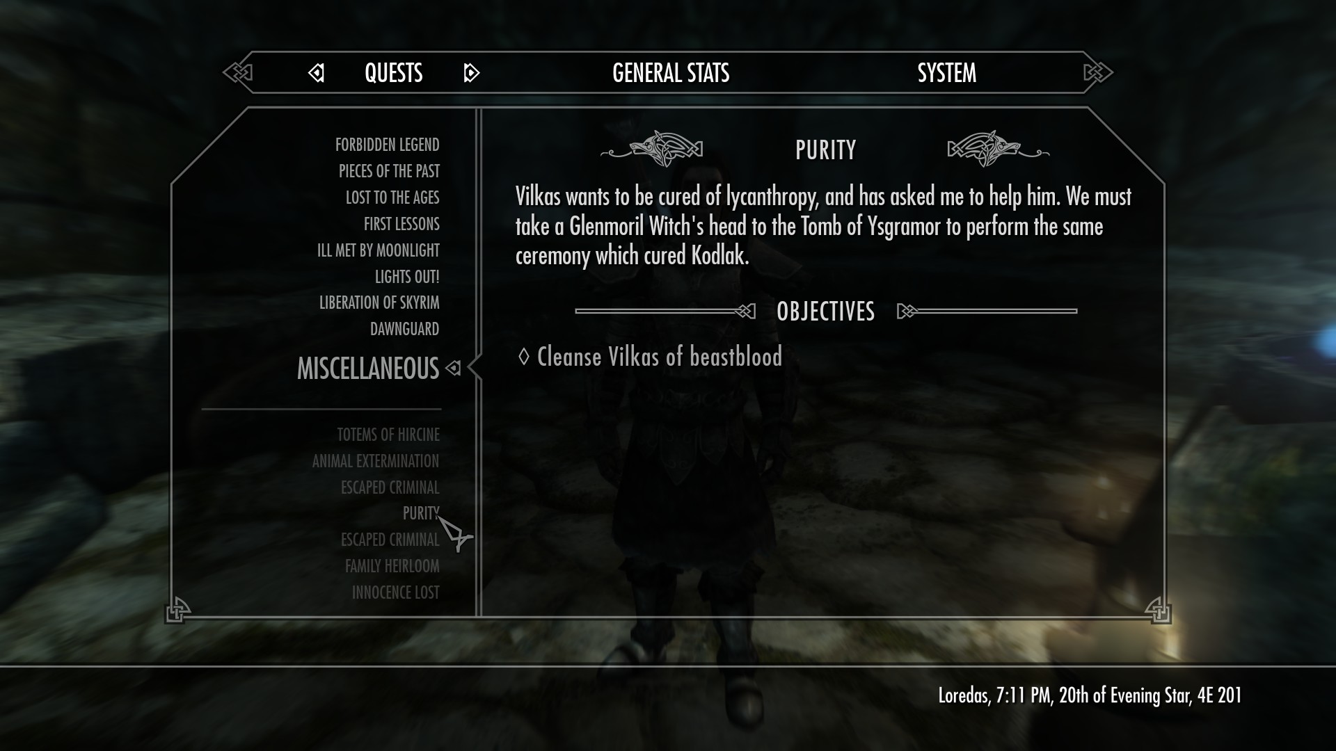 This evening I was working on completing the Companions quest line, one of the most popular quest lines in the game. I had already achieved the Werewolf Mastered Steam achievement, and had already been named Harbinger of the Companions by finishing the last primary quest “Glory of the Dead”. This led me to working on some of the radiant quests, which brings you to cleansing both Vilkas and Farkas of their lycanthropy.